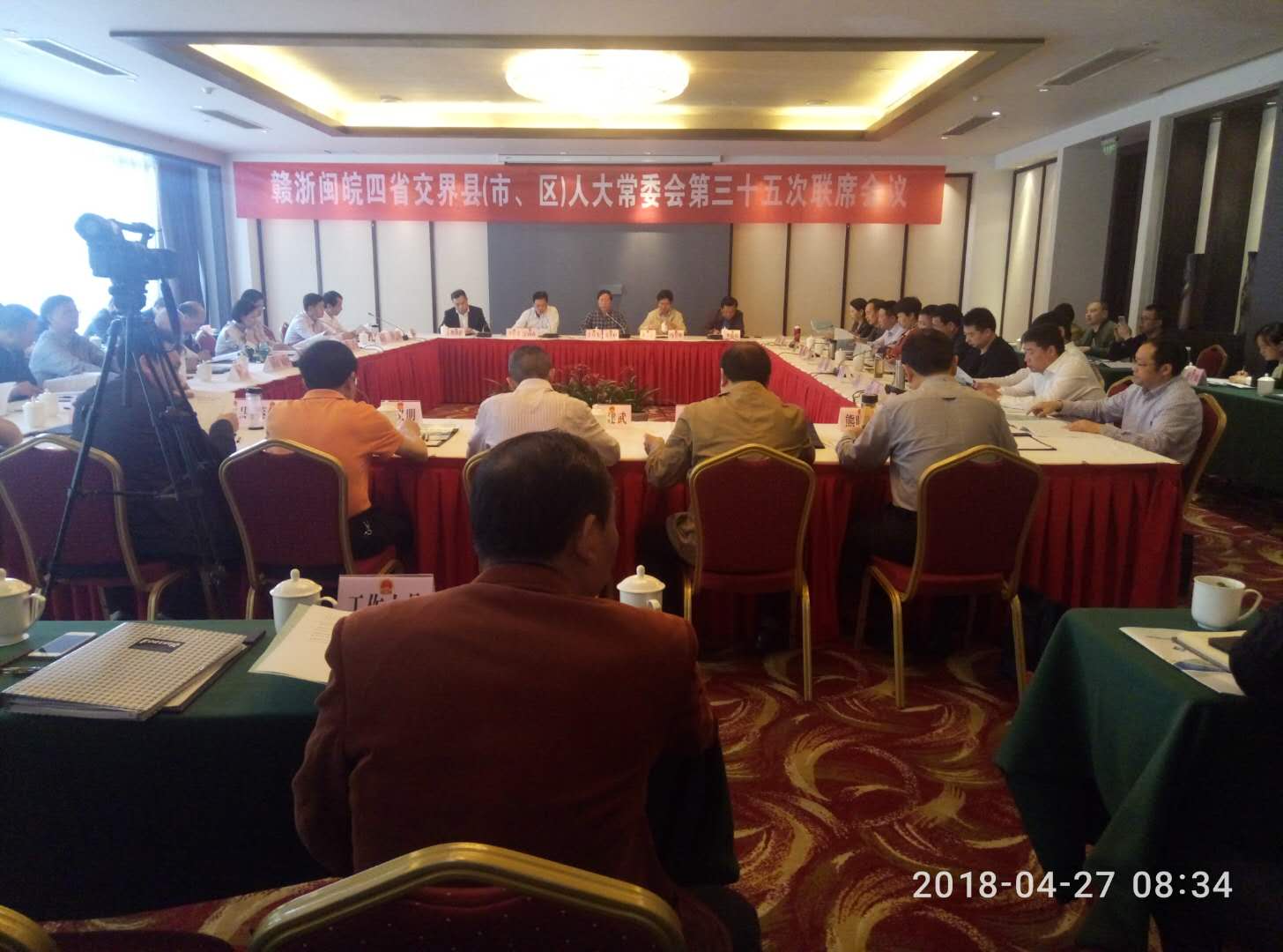赣浙闽皖四省交界县(市、区)人大常委会第三十五次联席会议于2018年4月26日至27日在安徽省休宁县举行。江西省德兴市、浮梁县、广丰区、婺源县、玉山县,浙江省常山县、江山市、开化县、龙泉市,福建省浦城县、松溪县,安徽省休宁县等十二个县(市、区)人大常委会领导、工作和办事机构负责人等60余人出席了会议。浮梁县人大常委会主任张永进、副主任徐福成等出席会议。